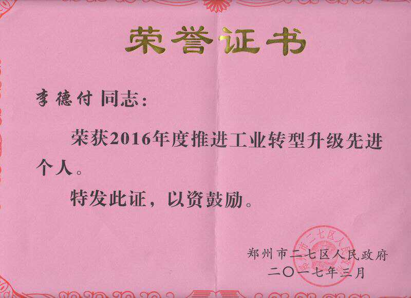 熱烈慶祝 華中食品李德付同志榮獲2016年度推進(jìn)工業(yè)轉(zhuǎn)型升級(jí)先進(jìn)個(gè)人,受到鄭州市二七區(qū)人民政府以政府公文的形式進(jìn)行高度的宣傳,表彰!我們衷心的向李總表示祝賀!